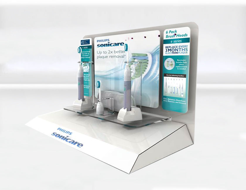 Exhibidor compacto que se coloca como extensión de la charola para maximizar visibilidad y optimizar espacio. Ideal para uso temporal en interiores y exteriores.