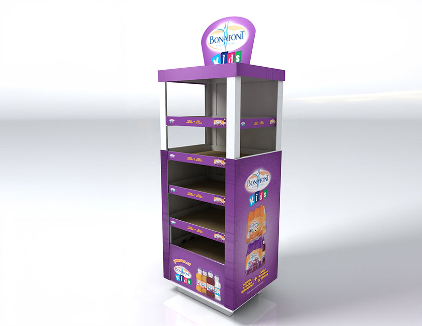 Exhibidor que se coloca regularmente en tarima, ideal para destacar grandes volúmenes de mercancía y maximizar la visibilidad en espacios de alto tráfico.